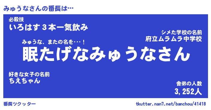 | 意味不明あだ名 | 『ペロリンみゅうな』『永久保存みゅうな』 |