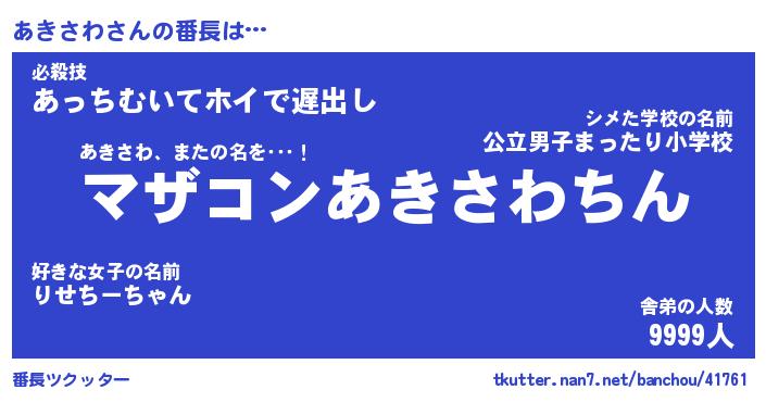 | 肩書あだ名 | 『あきさわ店長』『あきさわ総理大臣』 |