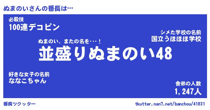 | 意味不明あだ名 | 『ペロリンぬまのい』『永久保存ぬまのい』 |