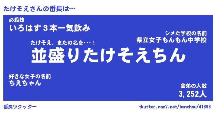 | 意味不明あだ名 | 『ペロリンたけそえ』『永久保存たけそえ』 |