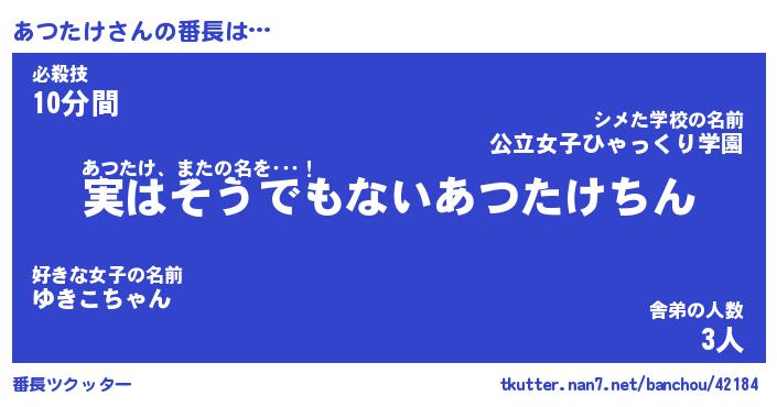 | ヒーロー風カッコイイあだ名 | 『スーパーアツタケ』『魔戒騎士アツ』 |