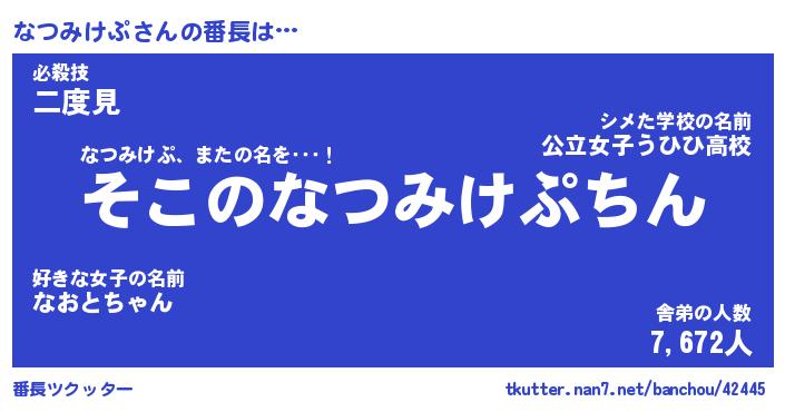 | 伝説のあだ名 | 『不死鳥のスナイパーなつみけぷ』 |