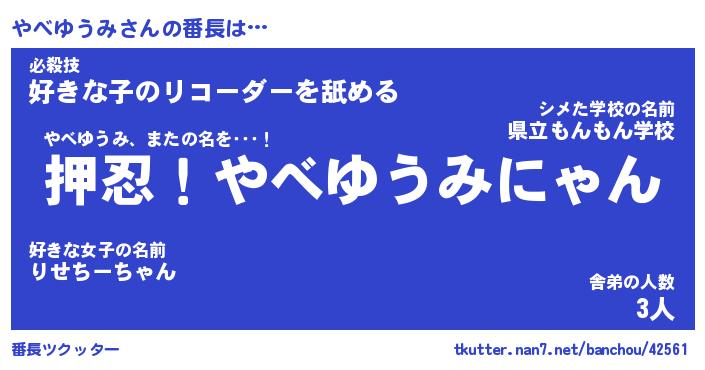 | ヒーロー風カッコイイあだ名 | 『スーパーヤベユウミ』『魔戒騎士ヤベ』 |