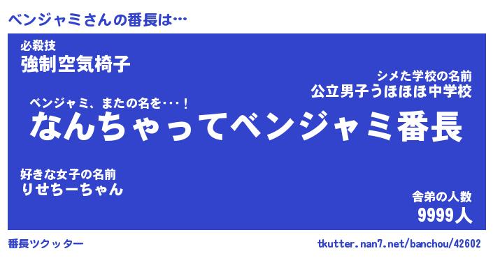 | 肩書あだ名 | 『ベンジャミ御曹司』『ベンジャミ大統領』 |