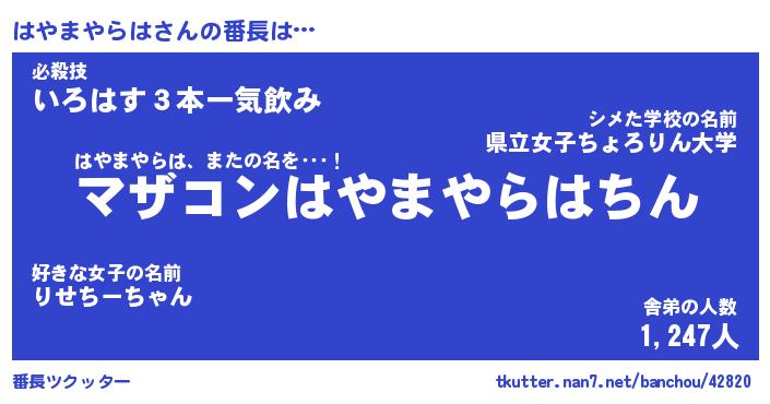 | 肩書あだ名 | 『はやまやらはCEO』『はやまやらは班長』 |
