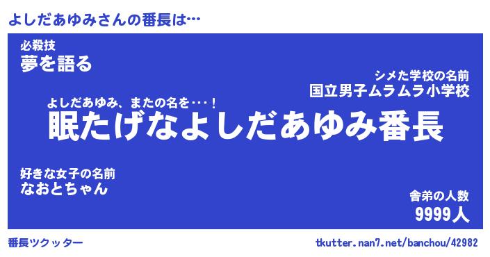 | 肩書あだ名 | 『よしだあゆみCEO』『よしだあゆみ大統領』 |