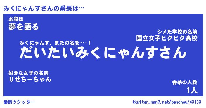 | ピコ太郎風あだ名 | 『ミコ五郎』『ピミ三郎』『ミク五郎』 |