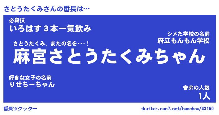 | 伝説のあだ名 | 『不死鳥のスナイパーさとうたくみ』 |