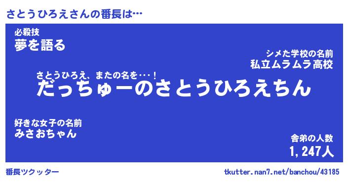 | ヒーロー風カッコイイあだ名 | 『スーパーサトウヒロエ』『魔戒騎士サト』 |