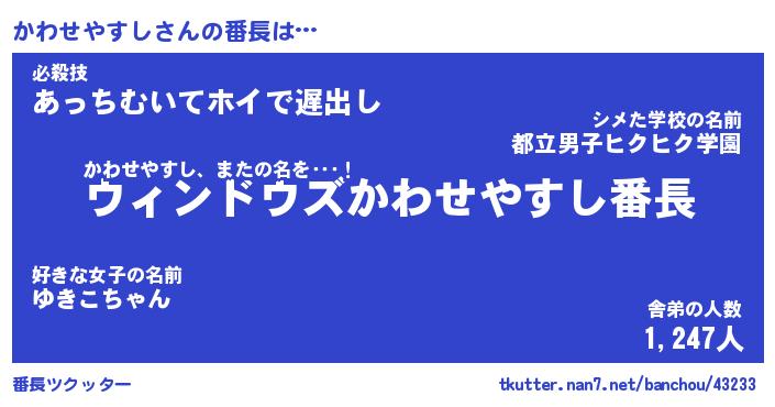 | ヒーロー風カッコイイあだ名 | 『スーパーカワセヤスシ』『銀牙騎士カワ』 |