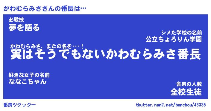| 肩書あだ名 | 『かわむらみさ社長』『かわむらみさ班長』 |