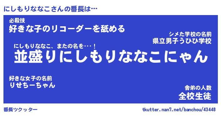 | 伝説のあだ名 | 『不死鳥のスナイパーにしもりななこ』 |