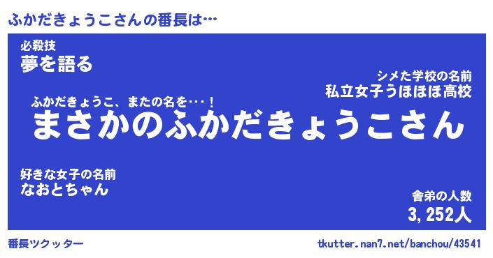 | 男性向けラノベタイトル風あだ名 | 『ふかだきょうこの憂鬱』 |
