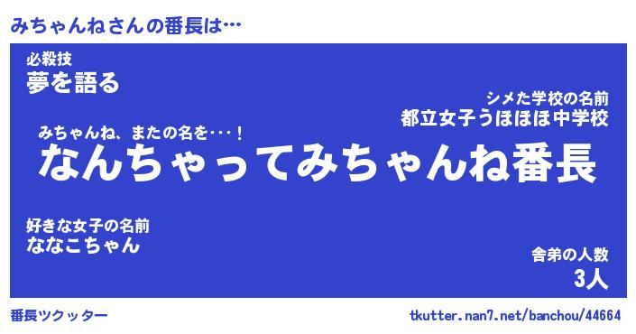 | 女子向けラノベタイトル風あだ名 | 『(仮)みちゃんねのやんごとなき事情』 |