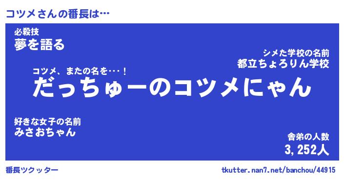 | ヒーロー風カッコイイあだ名 | 『スーパーコツメ』『ウルトラコツメマン』 |