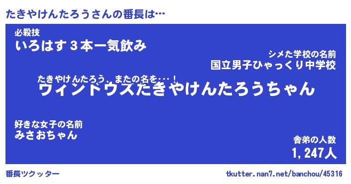 | 男性向けラノベタイトル風あだ名 | 『たきやけんたろうの憂鬱』 |