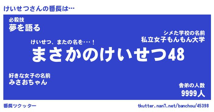 | 肩書あだ名 | 『けいせつCEO』『けいせつ総理大臣』 |