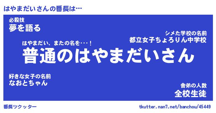 肩書あだ名 | 『はやまだい御曹司』『はやまだい班長』 |