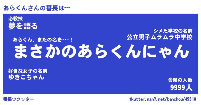 | ヒーロー風カッコイイあだ名 | 『スーパーアラクン』『天弓騎士アラ』 |