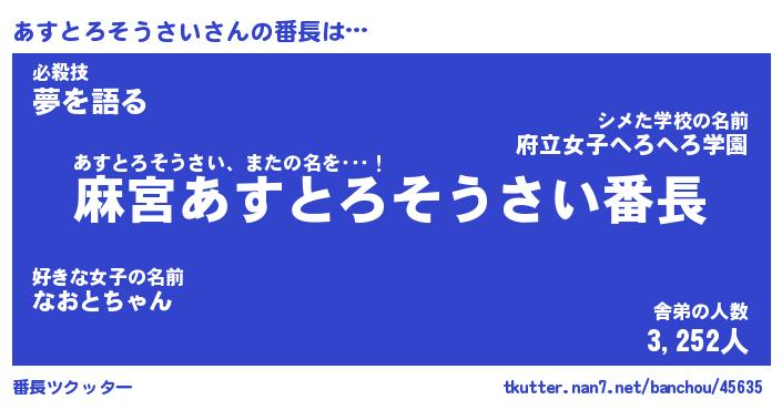 | ヘコむあだ名 | 『あすもー』『豆乳』『あすっぺ』 |
