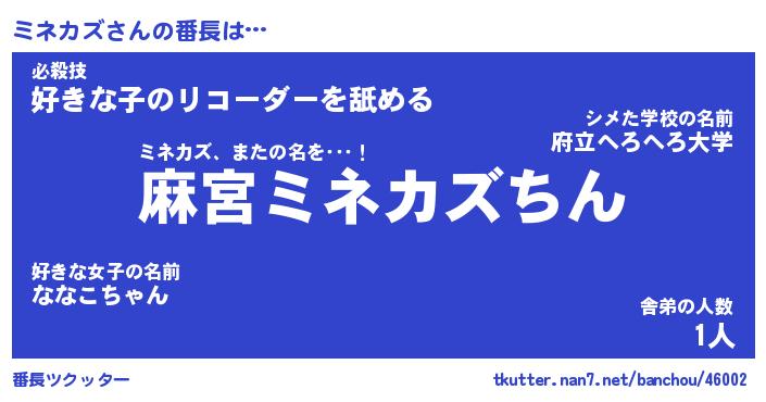 | 意味不明あだ名 | 『ペロリンミネカズ』『永久保存ミネカズ』 |