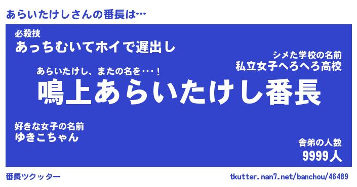 | ヒーロー風カッコイイあだ名 | 『スーパーアライタケシ』『天弓騎士アラ』 |