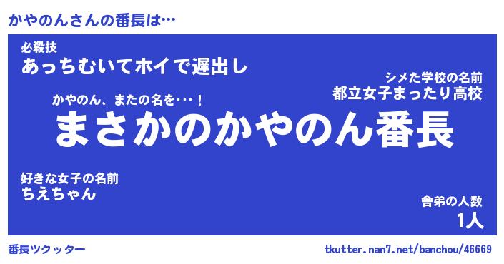 | 意味不明あだ名 | 『ペロリンかやのん』『永久保存かやのん』 |