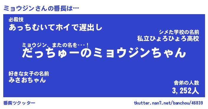 | 肩書あだ名 | 『ミョウジン社長』『ミョウジン総理大臣』 |