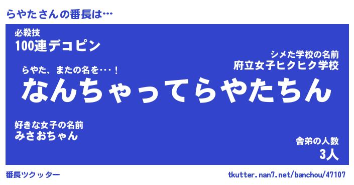 | 意味不明あだ名 | 『ペロリンらやた』『らやたフォーエバー』 |