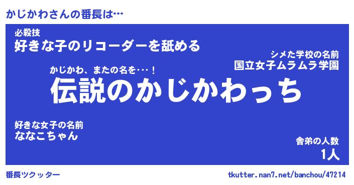 | 肩書あだ名 | 『かじかわ御曹司』『かじかわ国家主席』 |