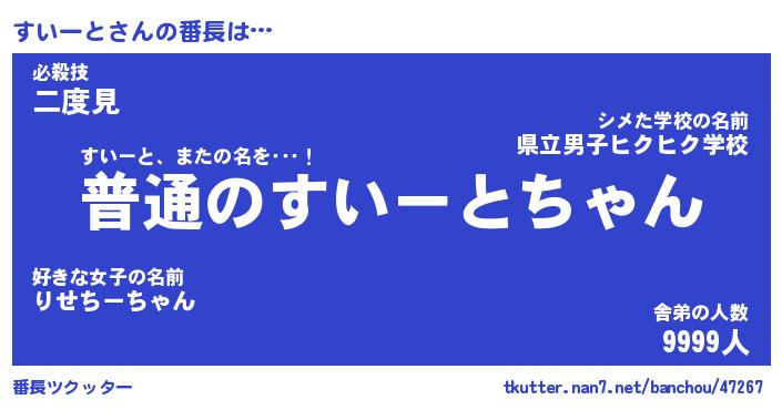 | ピコ太郎風あだ名 | 『スコ一郎』『ピス四郎』『スイ六郎』 |