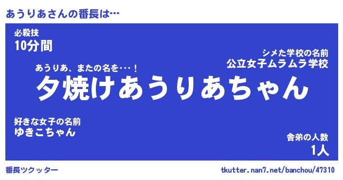 | 意味不明あだ名 | 『ペロリンあうりあ』『永久保存あうりあ』 |