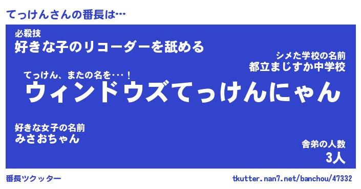 | 意味不明あだ名 | 『ペロリンてっけん』『永久保存てっけん』 |