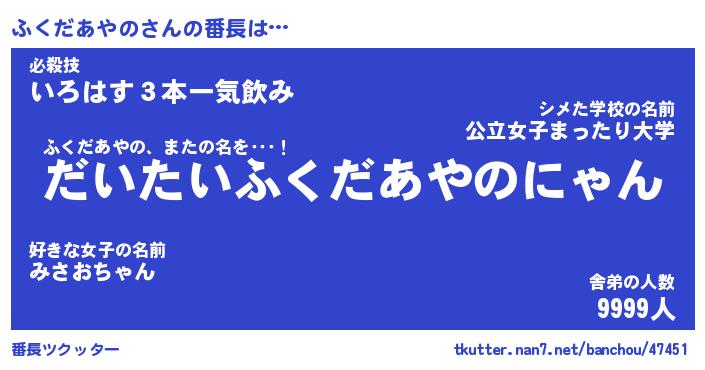 | 肩書あだ名 | 『ふくだあやの御曹司』 |