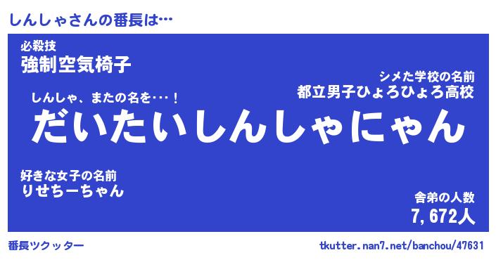 | 意味不明あだ名 | 『ペロリンしんしゃ』『永久保存しんしゃ』 |