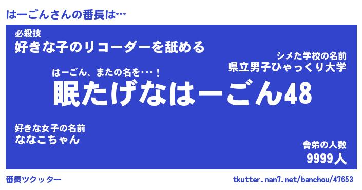 | 意味不明あだ名 | 『ペロリンはーごん』『永久保存はーごん』 |
