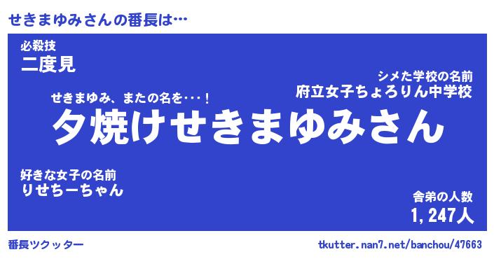 | 伝説のあだ名 | 『封印されしスナイパーせきまゆみ』 |