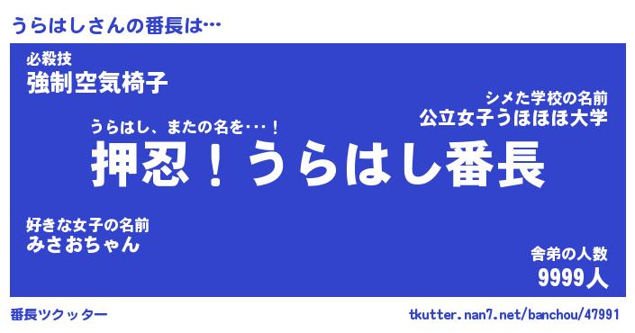 | 肩書あだ名 | 『うらはし御曹司』『うらはし国家主席』 |