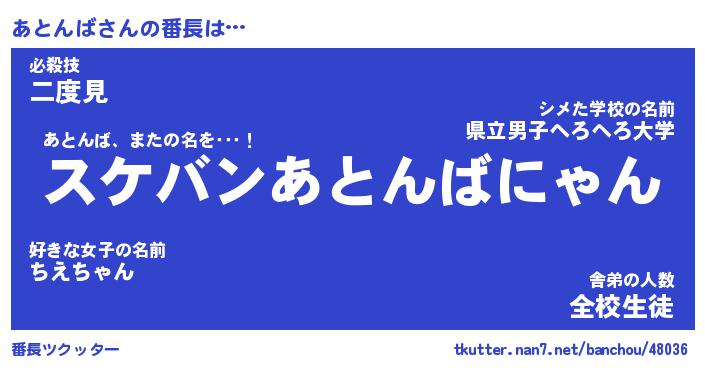 | 肩書あだ名 | 『あとんば店長』『あとんば国家主席』 |