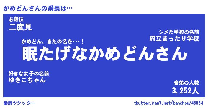| 意味不明あだ名 | 『ペロリンかめどん』『永久保存かめどん』 |