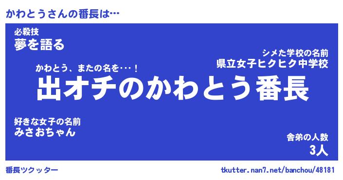 | ヒーロー風カッコイイあだ名 | 『スーパーカワトウ』『魔戒騎士カワ』 |