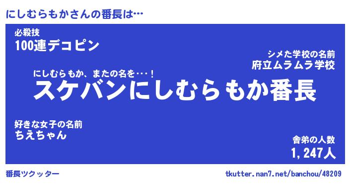 肩書あだ名 | 『にしむらもか店長』『にしむらもか班長』 |