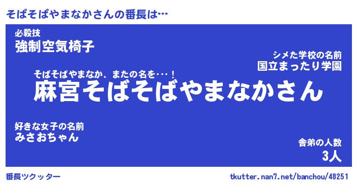 | 男性向けラノベタイトル風あだ名 | 『ソバソバヤマナカアートオンライン』 |