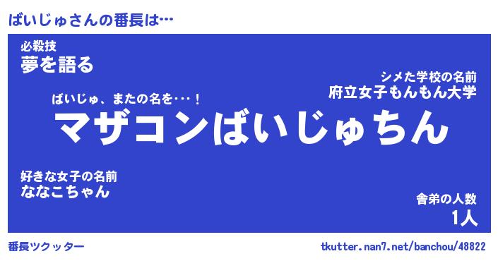 | 恥ずかしいあだ名 | 『プリティーばいじゅ』『ばいっちょ』 |