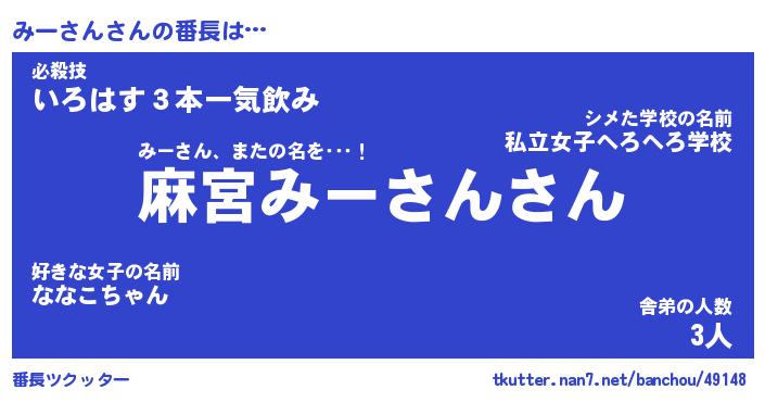 | 意味不明あだ名 | 『ペロリンみーさん』『永久保存みーさん』 |