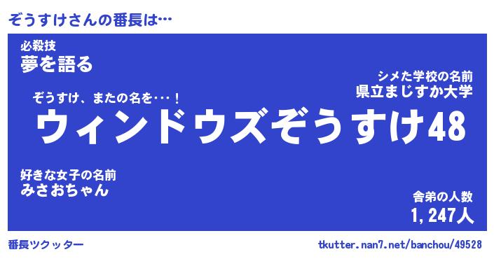 | 意味不明あだ名 | 『ペロリンぞうすけ』『永久保存ぞうすけ』 |
