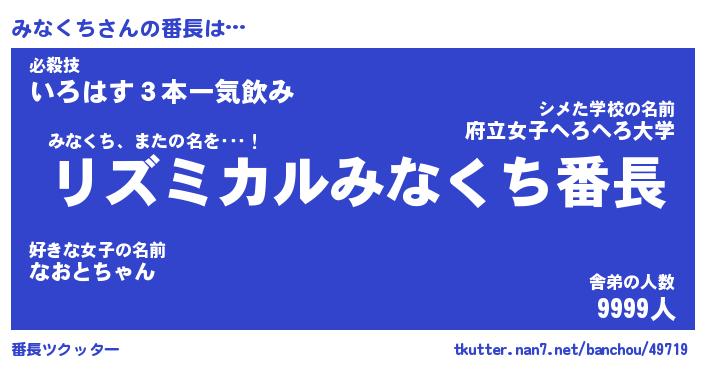 | 肩書あだ名 | 『みなくち社長令嬢』『みなくち総理大臣』 |