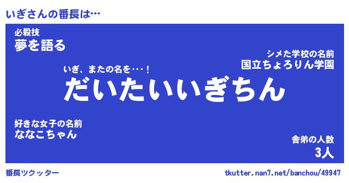 | ヒーロー風カッコイイあだ名 | 『スーパーイギ』『ウルトラいぎマン』 |