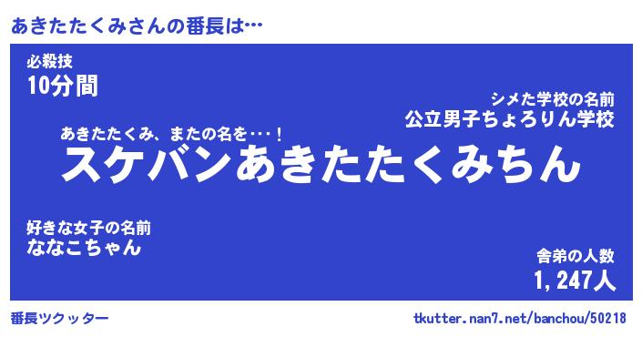 | ヒーロー風カッコイイあだ名 | 『スーパーアキタタクミ』『銀牙騎士アキ』 |