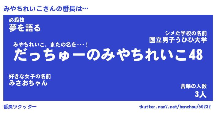 | ピコ太郎風あだ名 | 『ミコ四郎』『ピミ次郎』『ミヤ四郎』 |